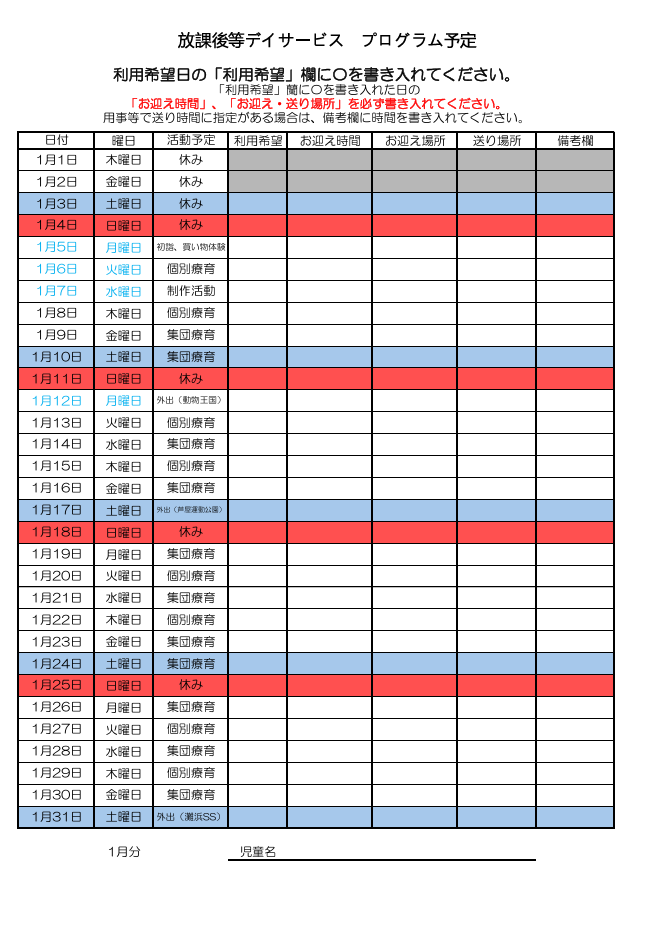 放課後等デイサービス:月曜日~土曜日(祝日を含む)