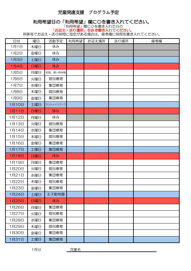 児童発達支援    :月曜日~土曜日(祝日を除く)
