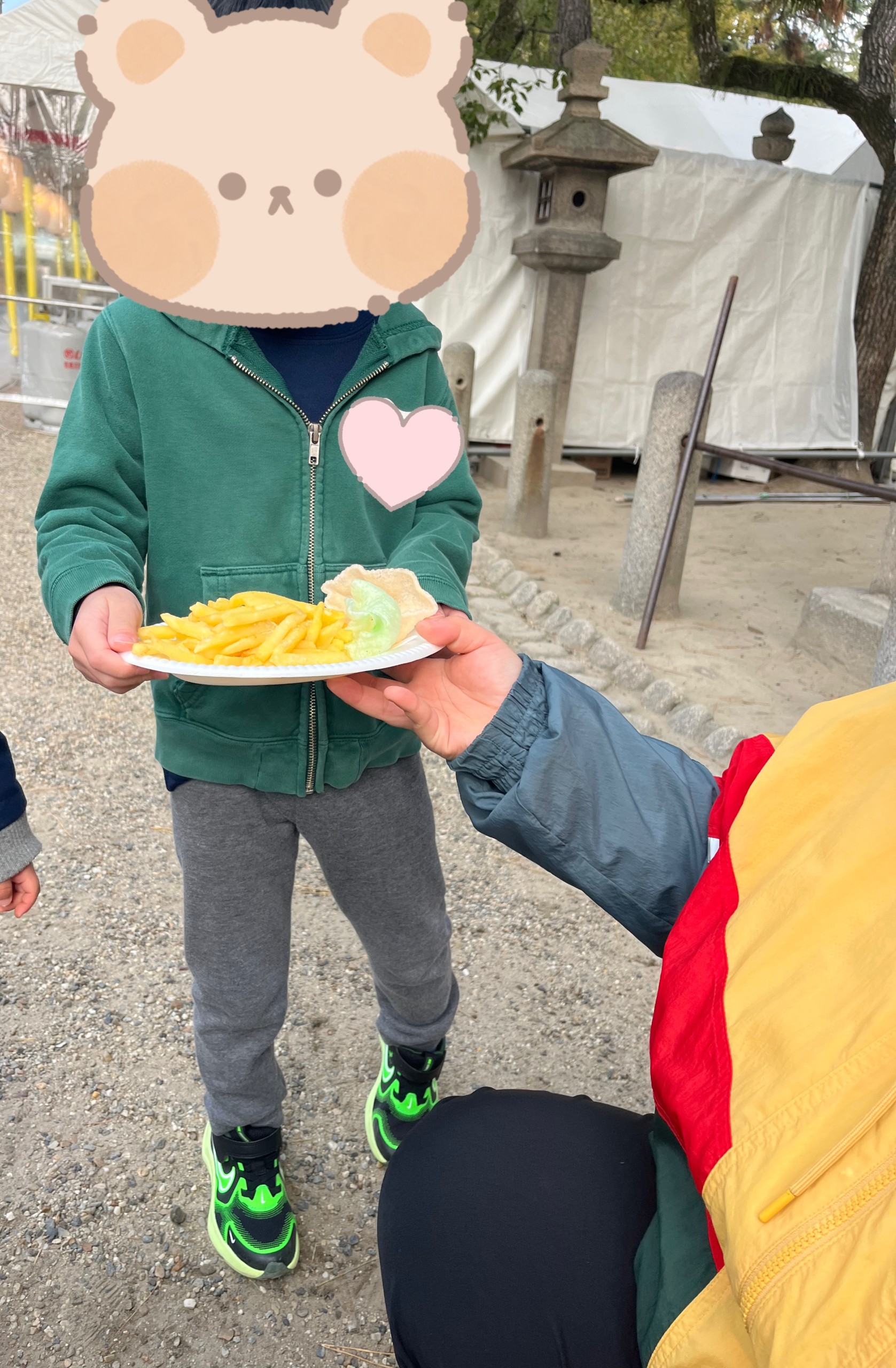 参拝後は、お待ちかねの買い物体験で、スタッフと一緒に屋台でベビーカステラやポテトなどを買って美味しそうに食べていました🤤