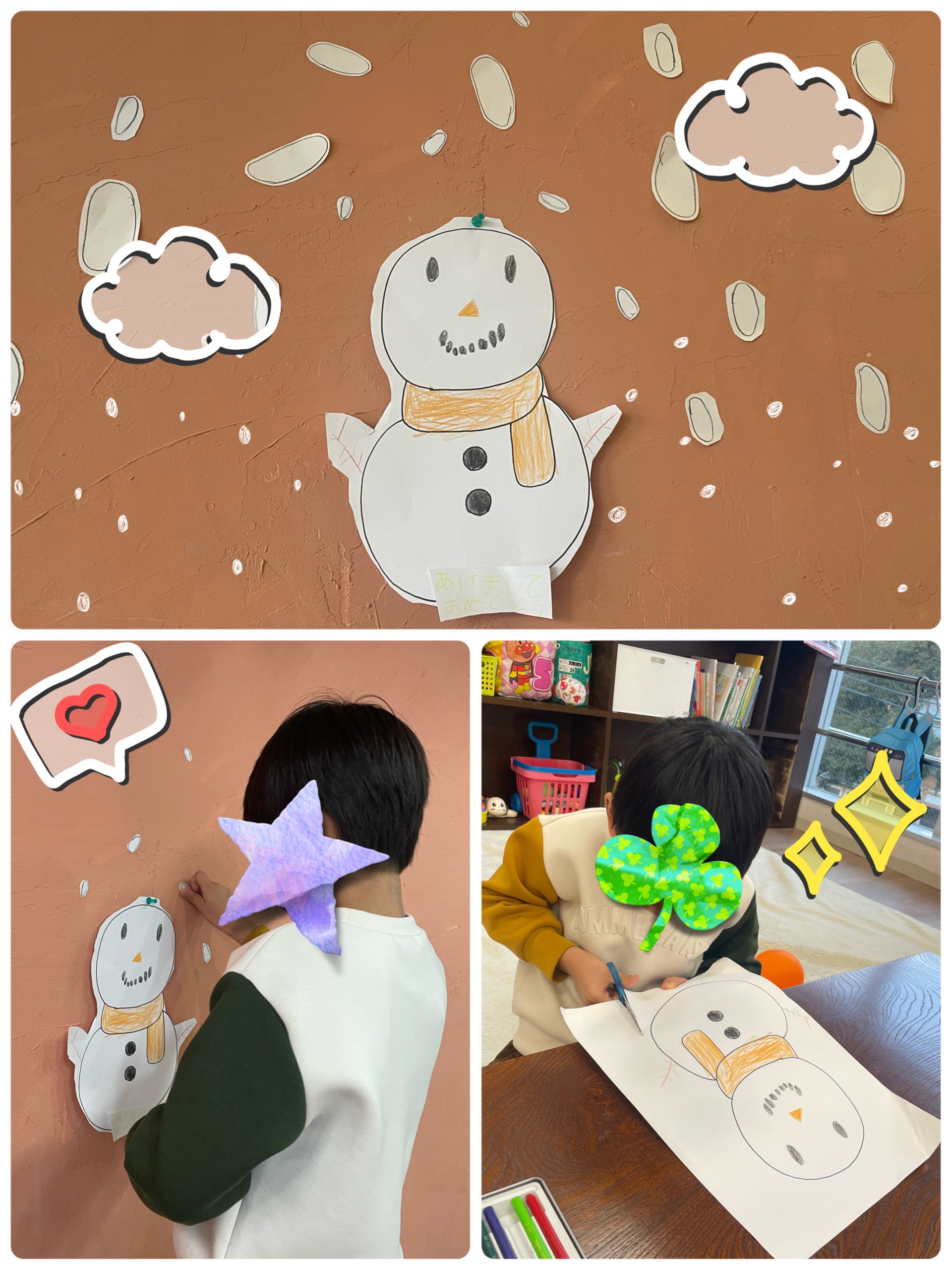 雪だるまの顔を描いて、マフラーやボタンを好きな色で塗りました🖍自分だけの雪だるまを壁に飾ると、「雪がないと、さみしそう!」と言い、ぱらぱら雪も描いて切って貼って…素晴らしいアイデアです🌨️✨️